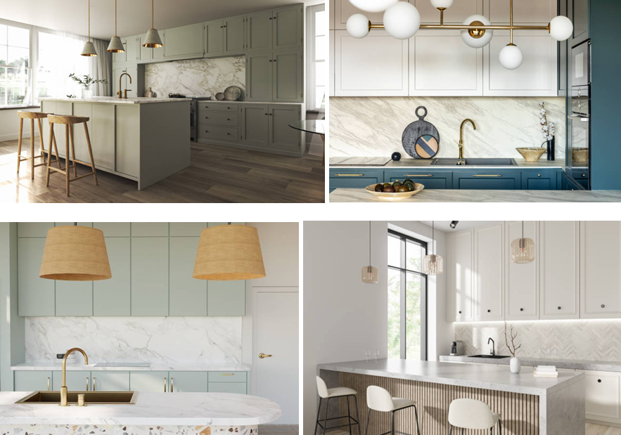 These hues pair beautifully with natural wood, expressive stone, ceramic finishes, and brushed metals—creating kitchens that feel calm, welcoming, and timeless.